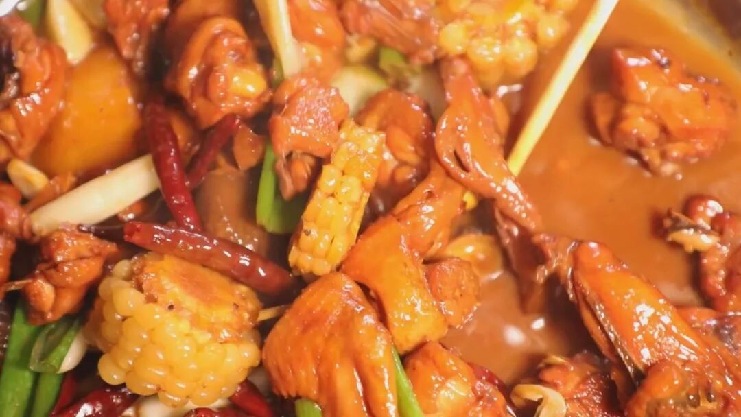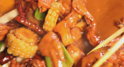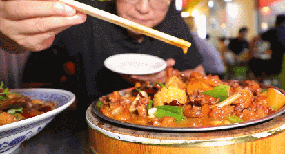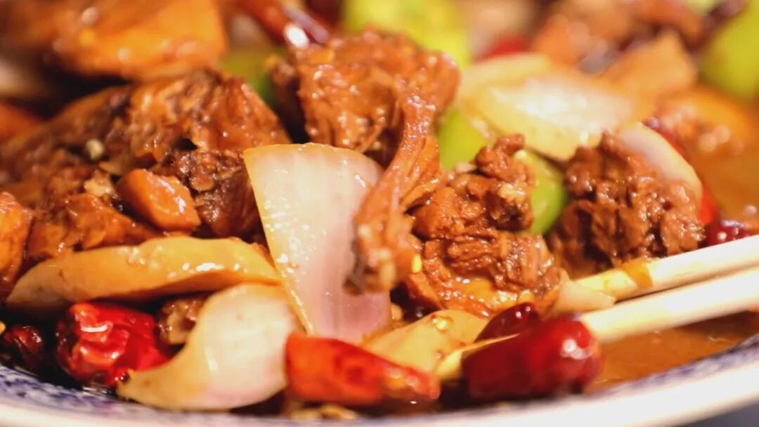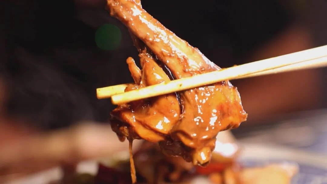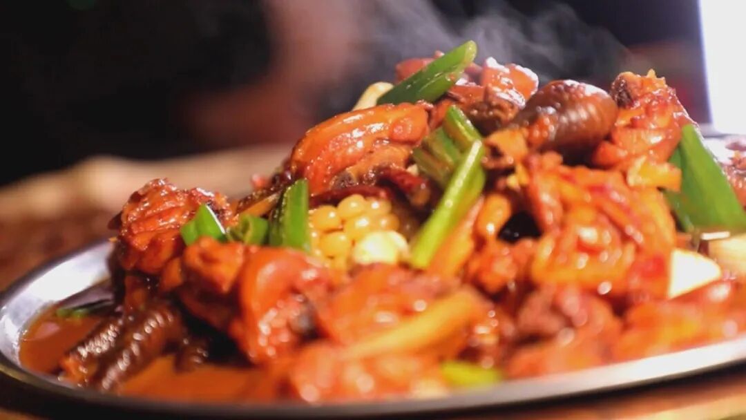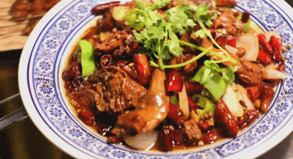 炒鸡卖相诱人,鸡块浸润在浓郁的酱汁里,青红椒点缀其间,上面还撒了一些翠绿的葱段。夹起一块儿在汤汁里蘸一下,一入口就有香辣的味道窜了出来。