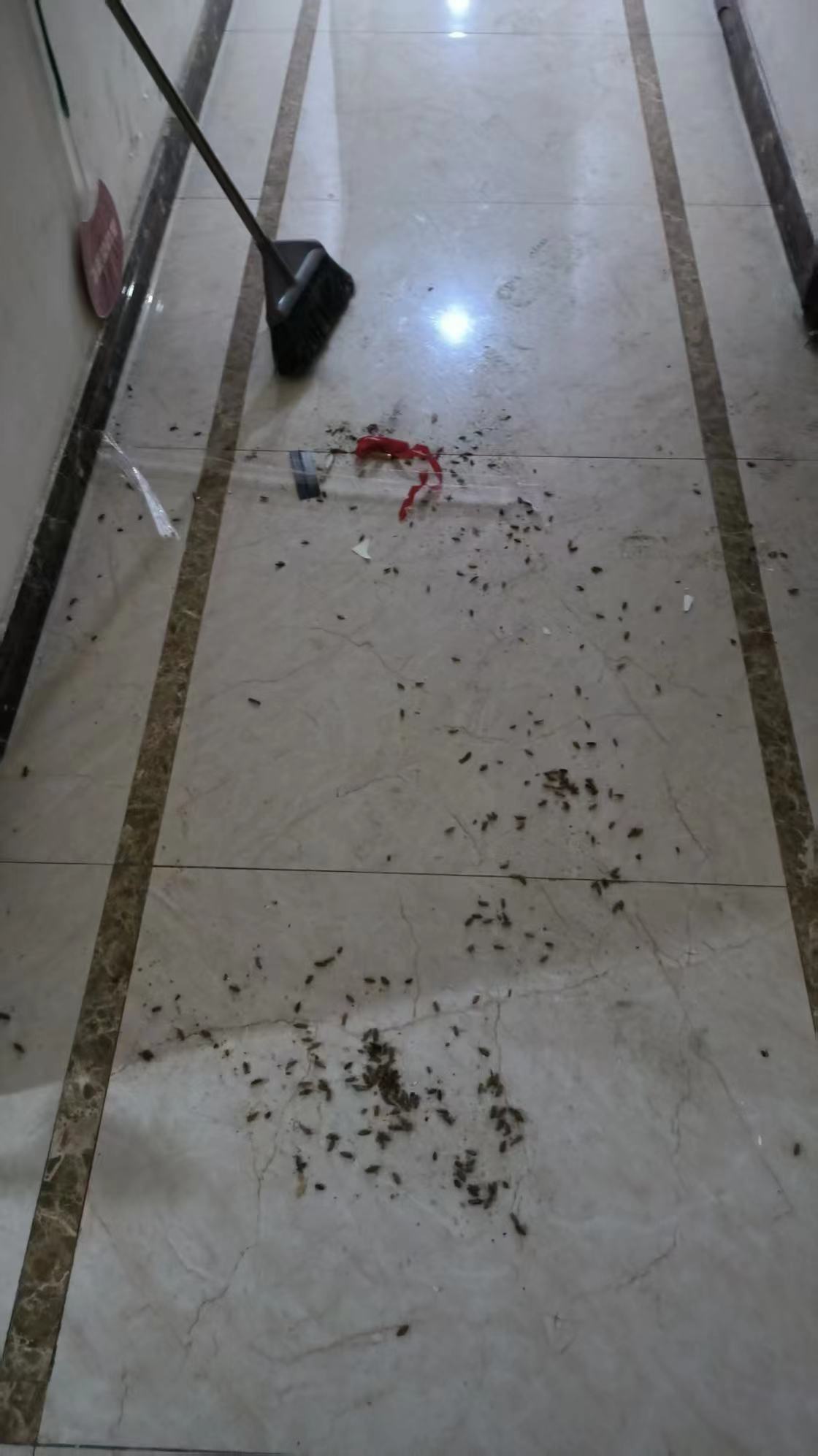据小区物业服务中心周经理介绍,这栋居民楼于2018年10月交房,共33层,有300住户。周经理说,最初是在2024年接到业主反映蟑螂滋生的情况,今年尤为严重,“满地都是,一天消杀三次,能清理出几百只,业主意见非常大。”