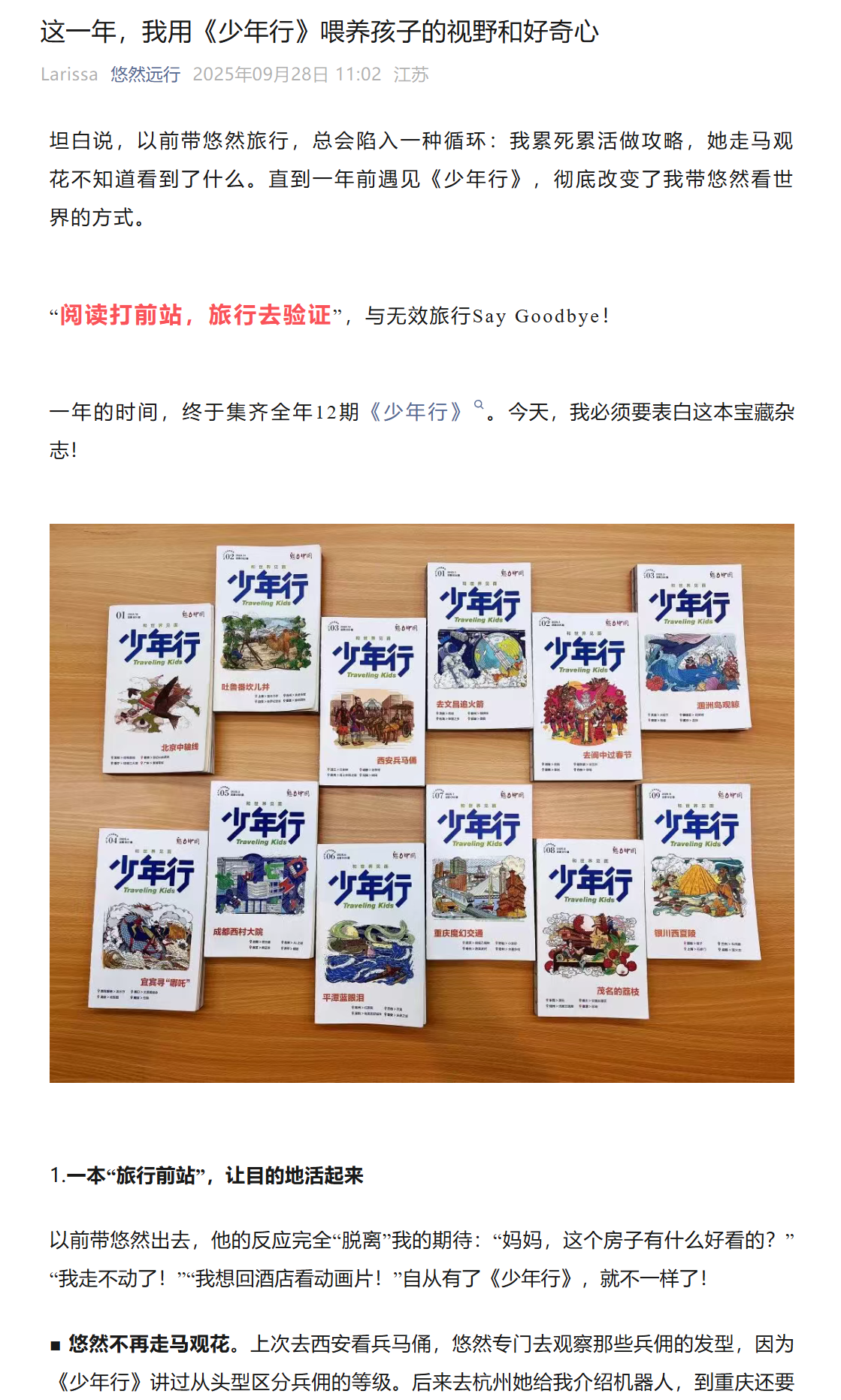 在过去的一年里,还有很多像悠然、力哥一样的孩子,在《少年行》的陪伴下,对世界的好奇心被点燃,知识储备不断丰富,思维方式逐渐拓展。而家长们也通过这本杂志,找到了与孩子共同探索世界的绝佳途径,亲子旅行也因此变得更加有意义。
