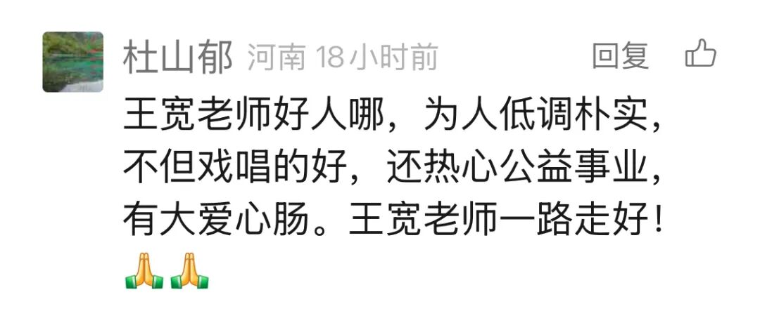 王宽退休后收养6名孤儿,为供养孩子们读书学艺,他放下艺术家身段,在茶楼卖唱七年,甚至以66岁高龄自费学习川剧变脸技艺以拓宽戏路。他与妻子王淑荣老师共同创办孤儿艺校,培养数百名留守儿童,并通过义演为慈善事业捐款逾百万元,荣获“中华慈善奖”“感动中国2015年度人物”等荣誉。他的善举被媒体誉为“台上唱好戏,台下做好人”的典范,其家庭被称为“中原大爱之家”。