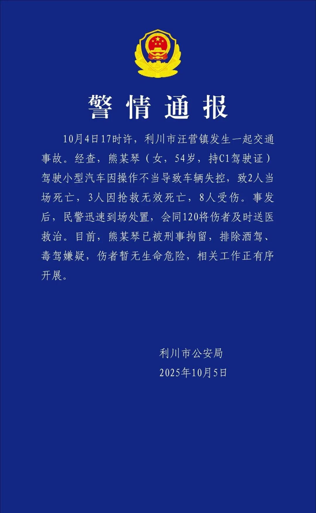 利川市公安局10月5日发布警情通报: