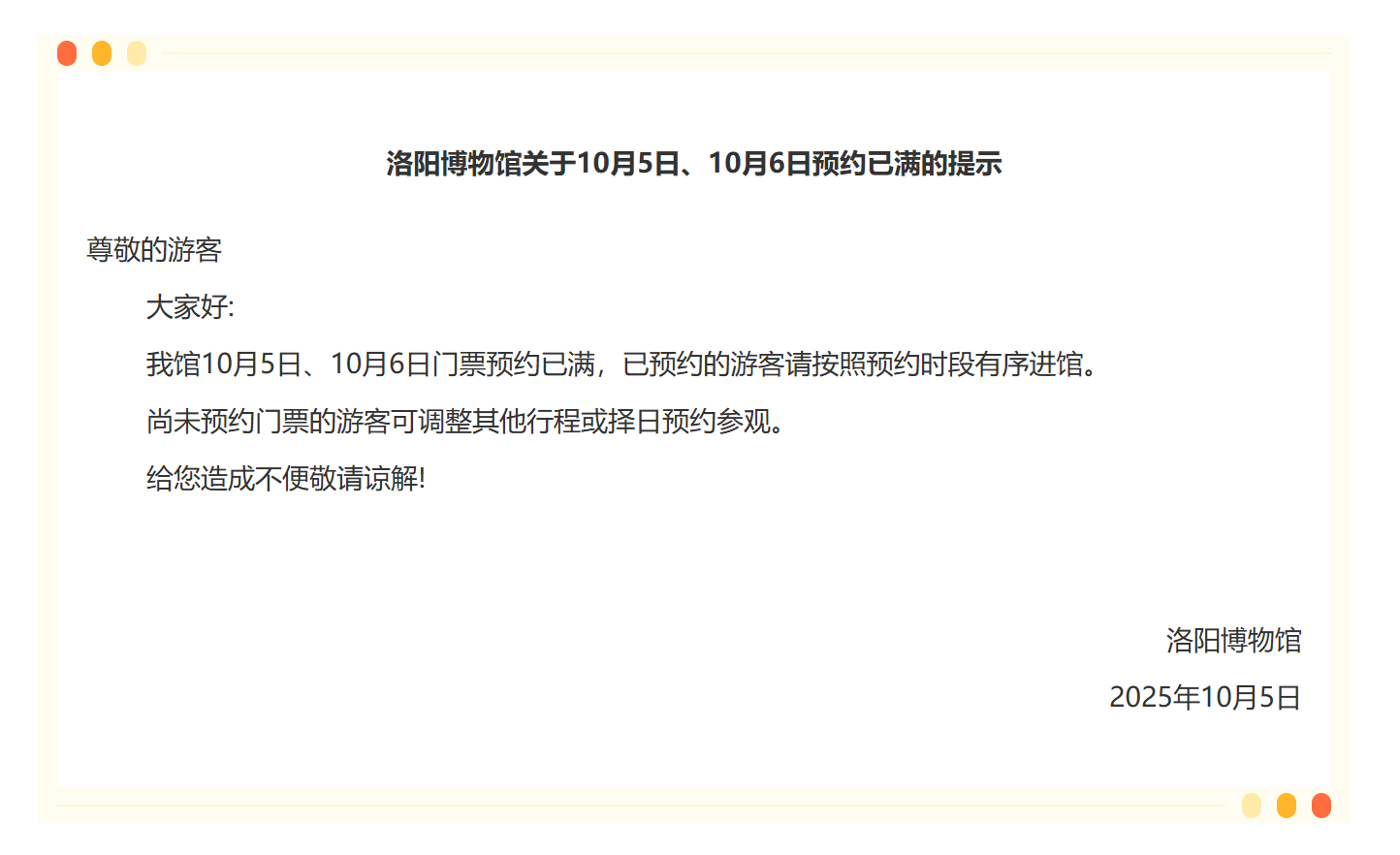 据洛阳博物馆,该馆10月5日、10月6日门票预约已满,尚未预约门票的游客可调整其他行程或择日预约参观。