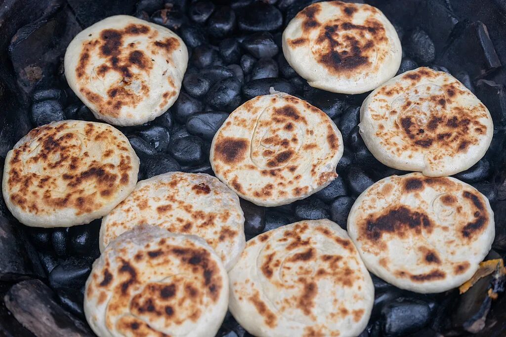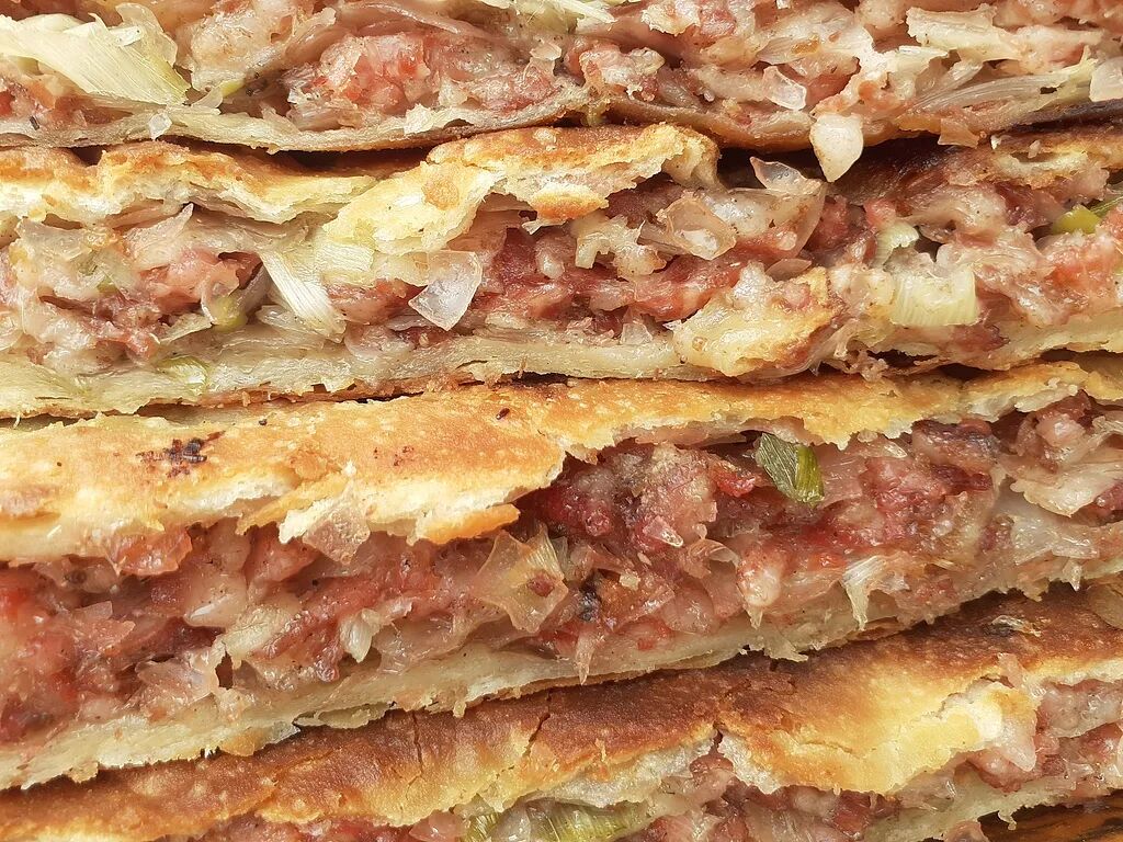 壮馍的个头可不小,直径能有半米,足足有六七斤重!它的外皮酥脆,内馅扎实,有肉馅、粉皮、鸡蛋等多种配料,层次分明。