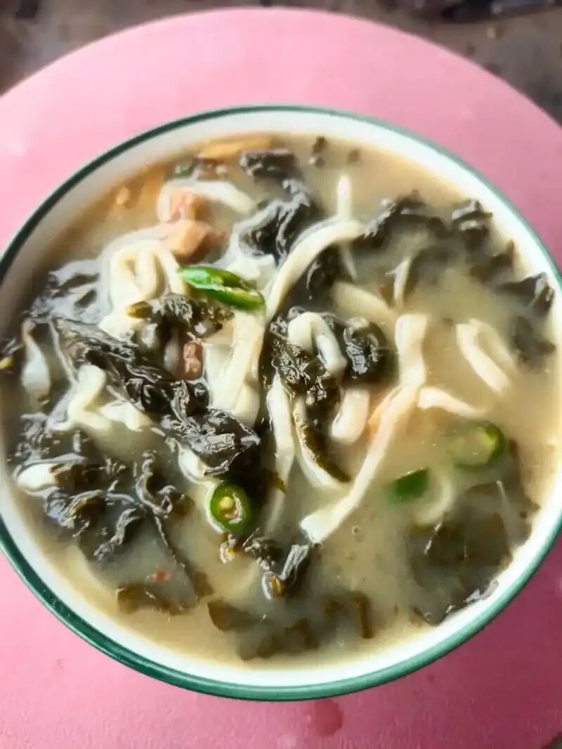 驻马店芝麻叶面条是当地农家秋季的常备美食。芝麻叶是秋季采收的时令野菜,与手擀面同煮,带有独特的芝麻香味,朴实无华却滋味悠长。