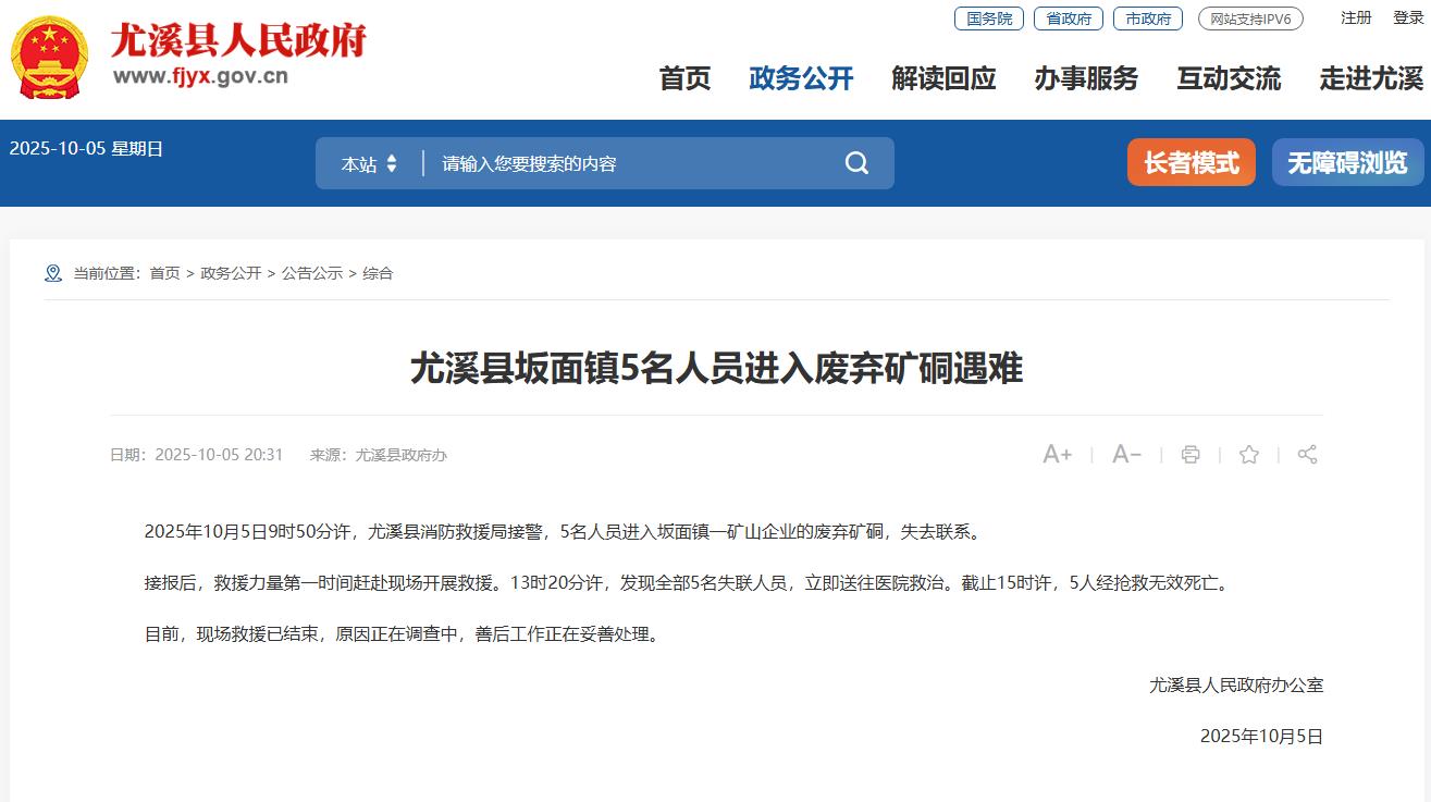 10月5日晚,福建省尤溪县人民政府办公室发布一则消息: 2025年10月5日9时50分许,尤溪县消防救援局接警,5名人员进入坂面镇一矿山企业的废弃矿硐,失去联系。 接报后,救援力量第一时间赶赴现场开展救援。13时20分许,发现全部5名失联