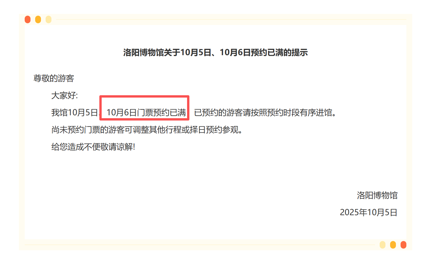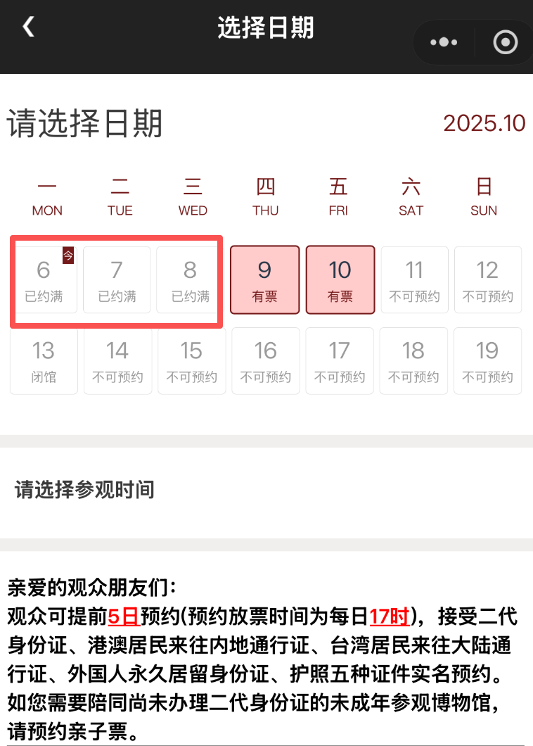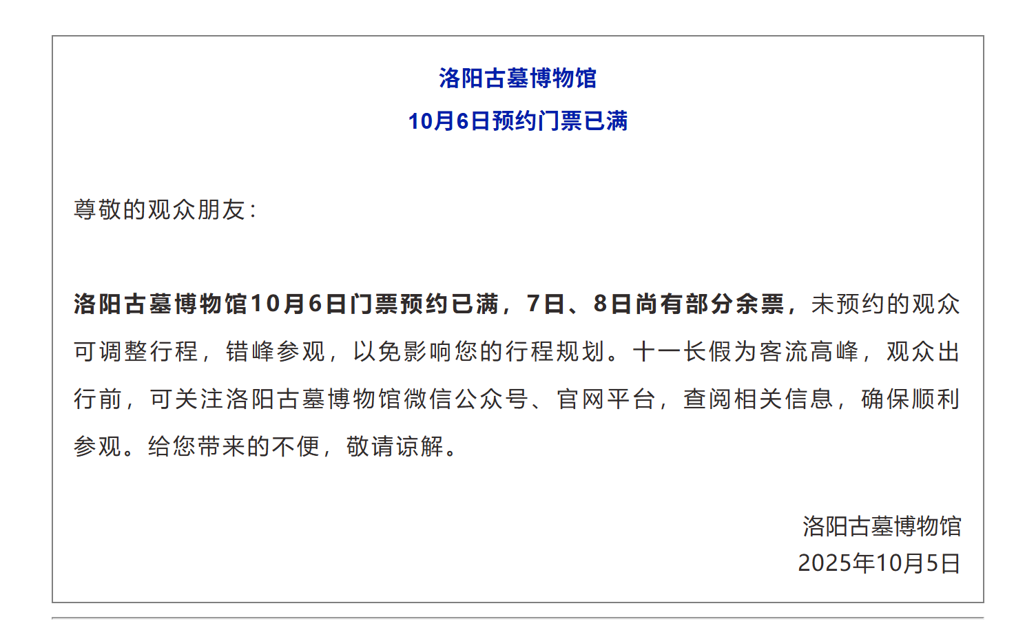 大象新闻·河南交通广播记者 宋冰霜 10月5日,记者从洛阳博物馆了解到,该馆10月5日、10月6日门票预约已满,尚未预约门票的游客可调整其他行程或择日预约参观。