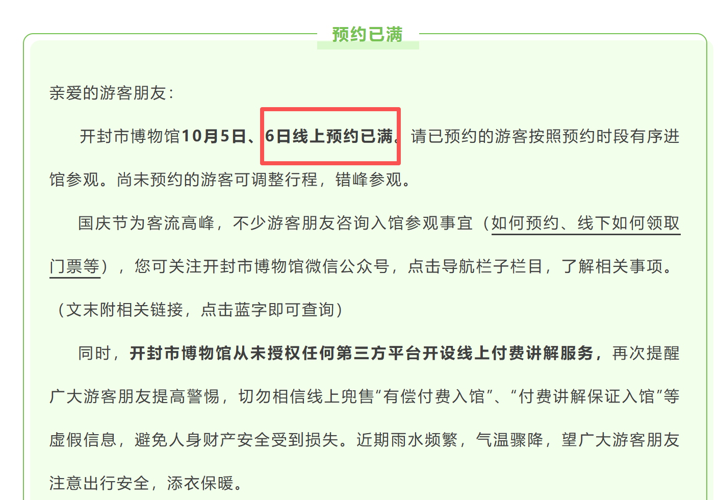记者从省内多家博物馆了解到,国庆中秋假期期间,大家对“博物馆游”热情高涨。据显示,今日(10月6日)河南省博物院、洛阳博物馆、开封博物馆等场馆门票预约已满,河南交通广播提醒大家提前安排其他行程。