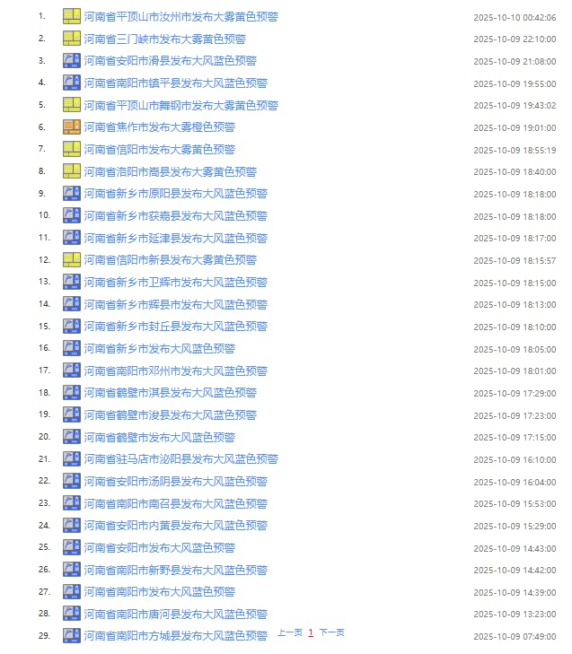 大象新闻记者10月10日从河南气象了解到,今天白天到夜里,淮河以北阴天,大部有小雨或零星小雨;其他县(市、区)多云。全省偏北风4级左右,北中部、西南部阵风6到7级。最高气温:西部、北中部12到14℃;东南部20到22℃;其他县(市、区)14到16℃。最低气温:东部、南部13到15℃;其他县(市、区)10到12℃。截至早上6点45,河南29个大雾、大风等预警信号生效中。