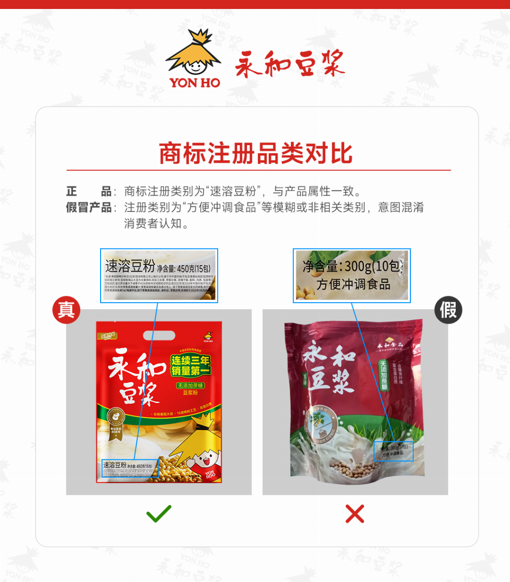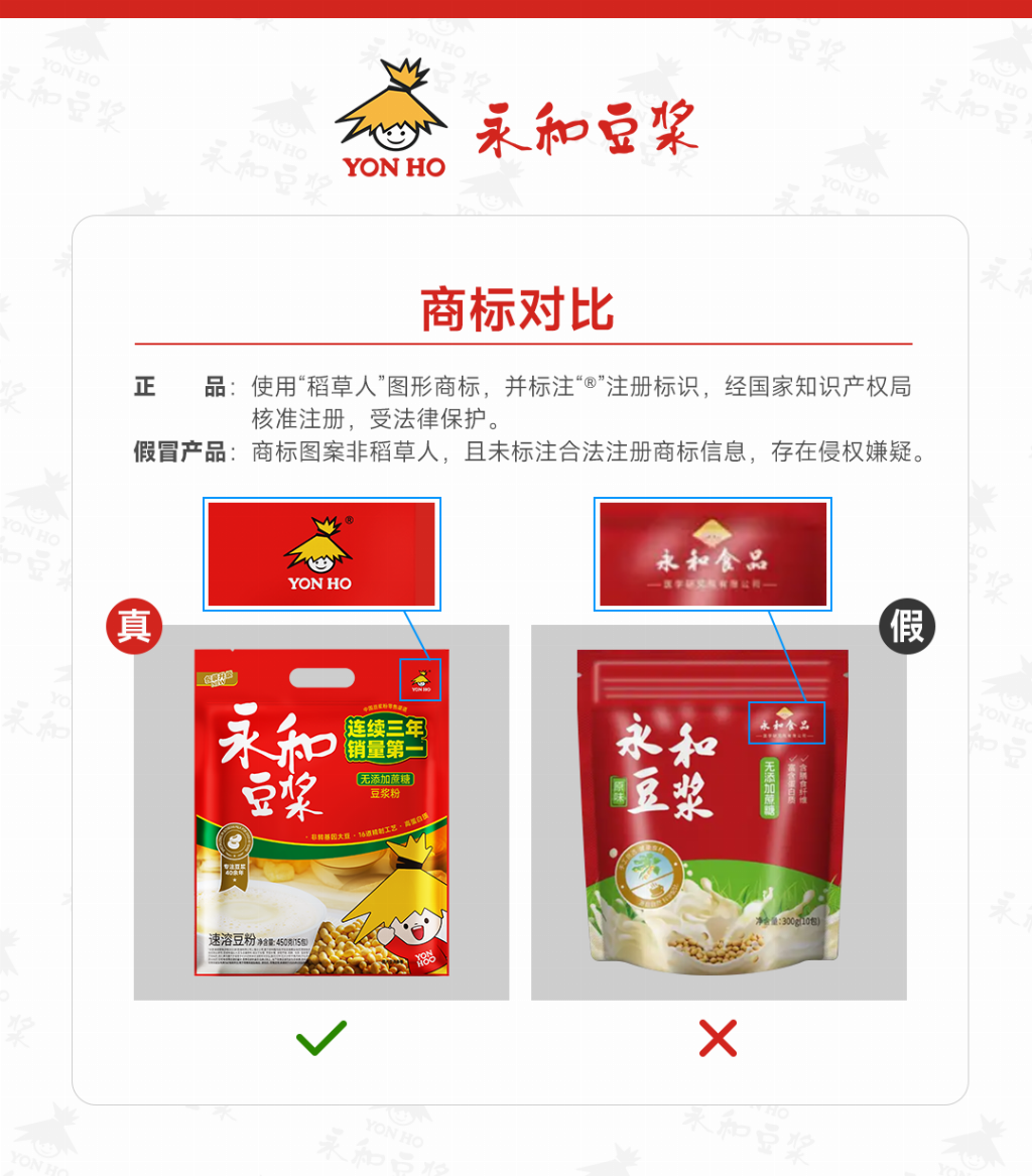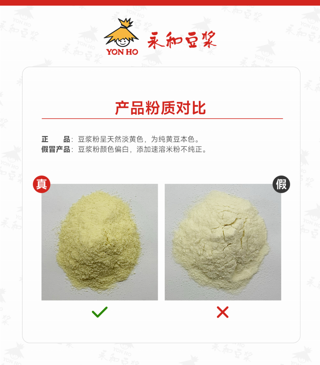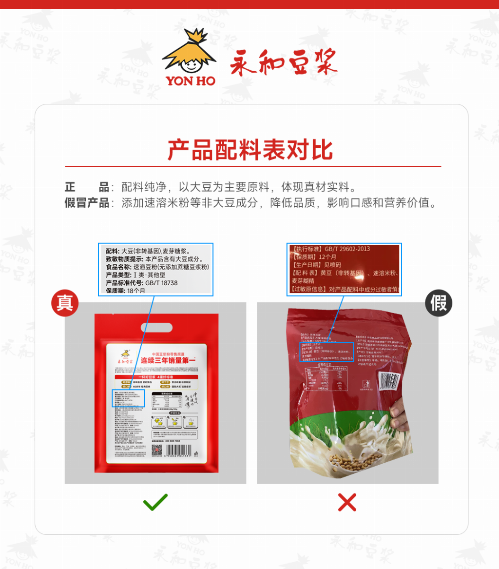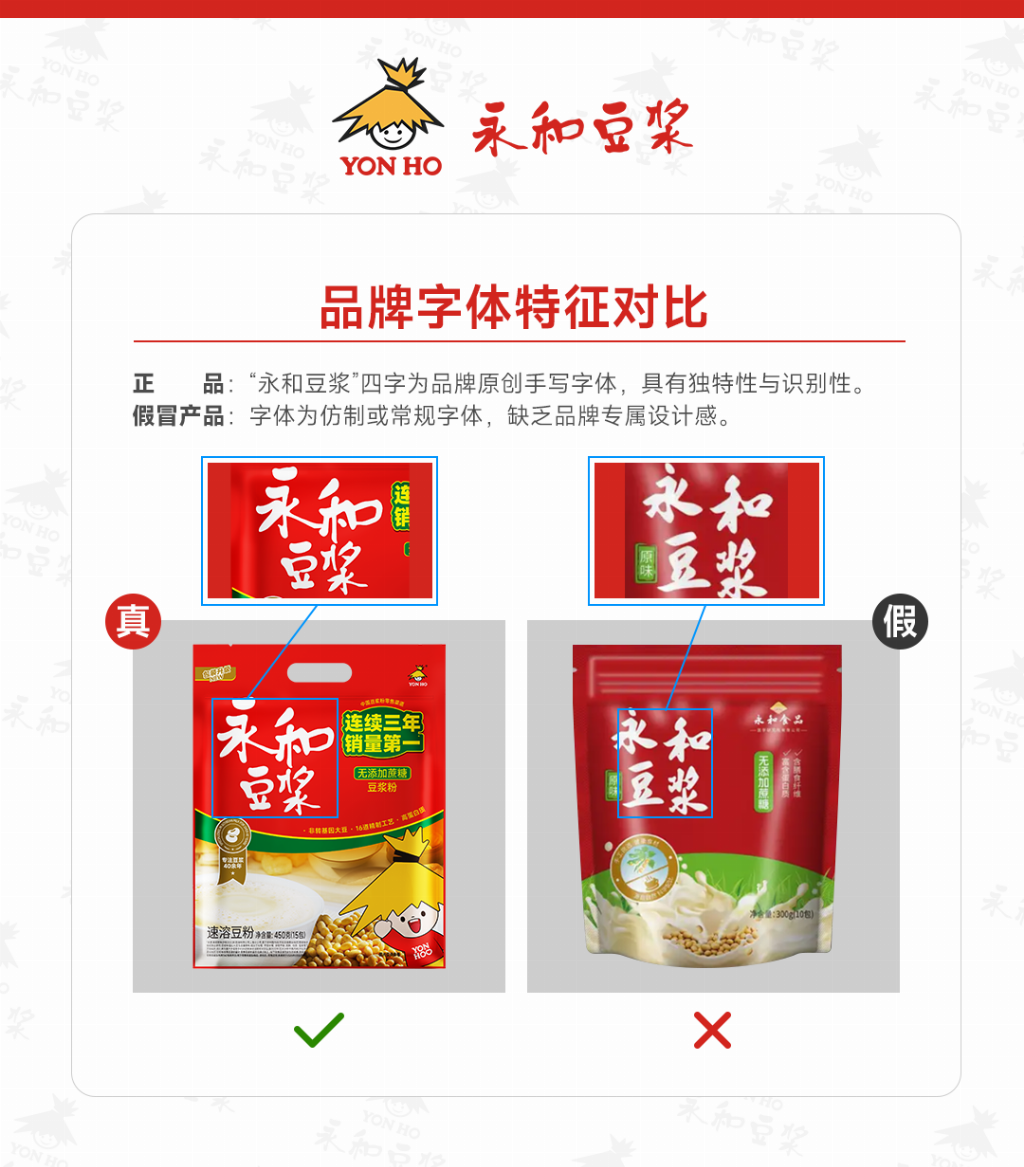 为帮助消费者清晰辨识,现将“永和豆浆”正品与市场假冒伪劣产品的主要区别,以正品永和豆浆 无添加庶糖豆浆粉450克为例。请广大消费者在购买时认准以上正品特征,选择正规渠道,谨防假冒,保障自身权益与健康。对比如下: