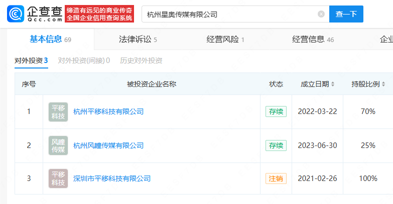 第三方数据显示,近30天影视飓风账号销售额约为750万—1000万,影视飓风官方旗舰店账号销售额约为100万—250万。企查查APP显示,该旗舰店认证主体公司即杭州平移科技有限公司由影视飓风(杭州星奥传媒有限公司)持股70%。目前,杭州星奥传媒公司共计对外投资有3家公司,除上述杭州平移科技外,在杭州风瞳传媒有限公司中持股25%,在深圳市平移科技有限公司中全资持股。