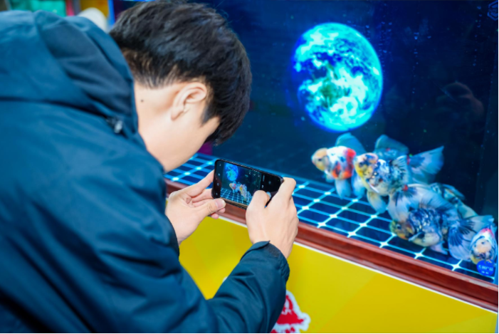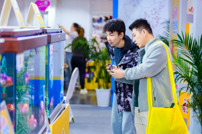 展区内的展板上,一组数据格外醒目,直观展现着福州金鱼产业的强劲实力:“全国五大第一”“100+家金鱼养殖场”“2500+亩养殖面积” “100+个特色金鱼品种”,让每一位参观者都深刻感受到福州金鱼产业的深厚底蕴与蓬勃活力。值得一提的是,本次参展还带来了金鱼茶宠、IP文创周边等跨界产品,这些融合金鱼文化的衍生品,成为宠物经济与文化消费碰撞的鲜活案例。近年来福州高度重视创作金鱼衍生产品,将金鱼同脱胎漆器、根雕、寿山石雕相结合,创作了众多金鱼衍生产品,让传统工艺与现代文创完美融合,展示福州金鱼文创产业发展状况,生动讲述福州金鱼文化故事。