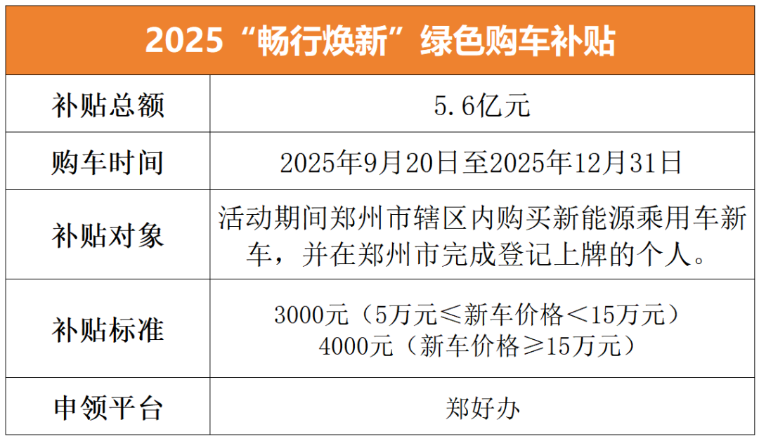 1. 绿色购车补贴9月20日及以后购买新能源汽车的郑州市民可以关注该项补贴,个人最高可获4000元补贴。申请入口将于近期在郑好办APP上线。