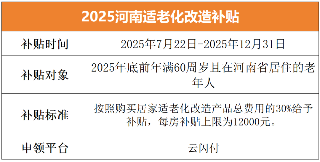 3. 2025河南适老化改造补贴省民政厅等五部门联合印发方案,明确对2025年底前年满60周岁的在本省居住的老年人,提供居家适老化改造专项补贴,每房最高可达1.2万元。