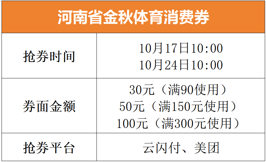2、河南省金秋体育消费券金秋体育消费券共有5期,目前大家还可以领取的为第四期和第五期。