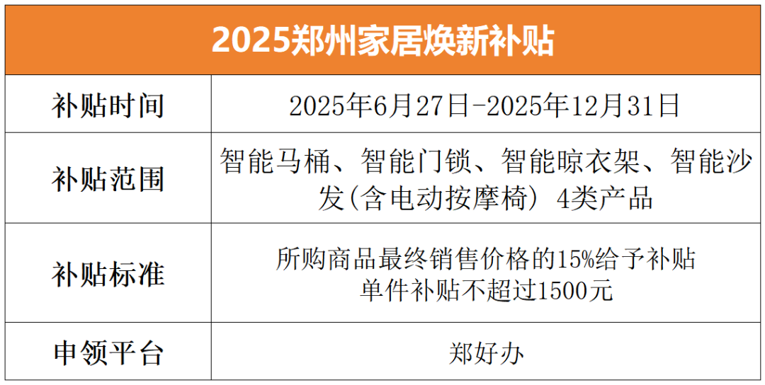 4. 郑州2025家居焕新补贴此项补贴主要针对智能化家居,涵盖智能马桶、智能门锁、智能晾衣架、智能沙发4类产品,单件补贴最高1500元。