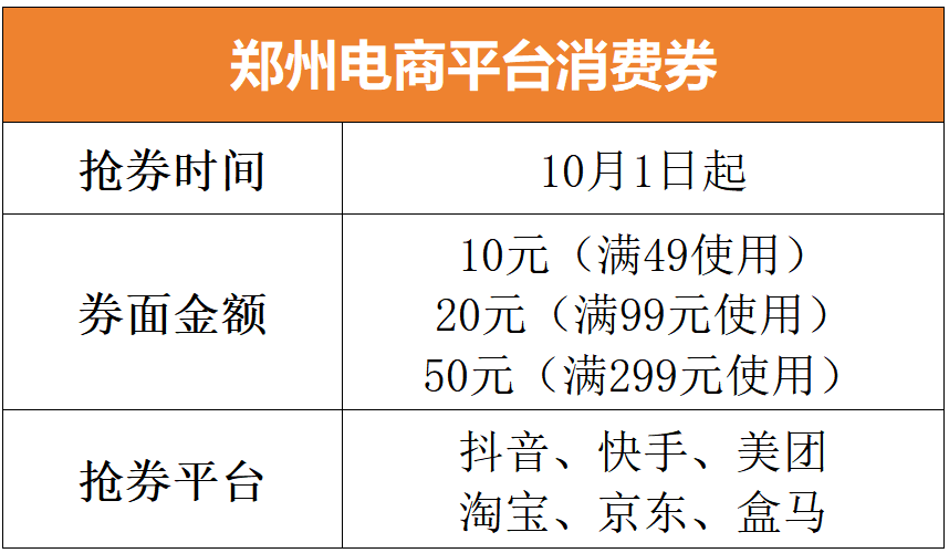 3、郑州电商平台消费券该消费券自10月1日起开始发放,具体领券时间请以各电商平台为准。