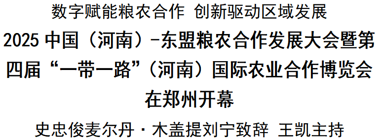 10月13日上午,2025中国(河南)—东盟粮农合作发展大会暨第四届“一带一路”(河南)国际农业合作博览会在郑州开幕。中国—东盟中心秘书长史忠俊、农业农村部副部长麦尔丹·木盖提、省委书记刘宁致辞。省长王凯主持。