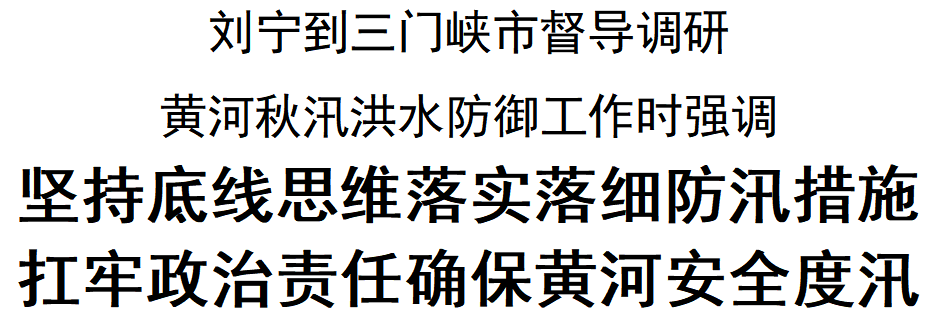 10月13日下午,省委书记刘宁到三门峡市,督导调研黄河秋汛洪水防御工作,强调要深入贯彻落实习近平总书记关于治水的重要论述和在河南考察时重要讲话精神,坚决扛牢保障黄河安澜政治责任,坚持底线思维、极限思维,全方位加强领导,全流域联防联控,落实落细防汛措施,确保黄河安全度汛,全力守护人民群众生命财产安全。