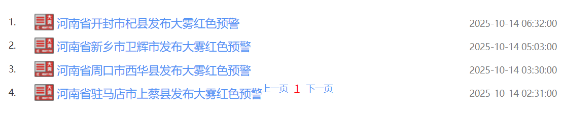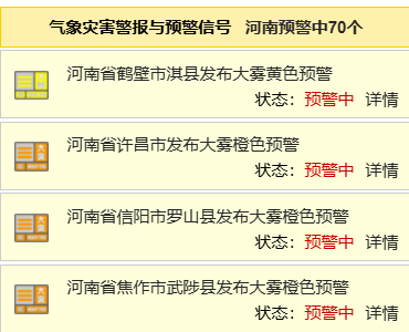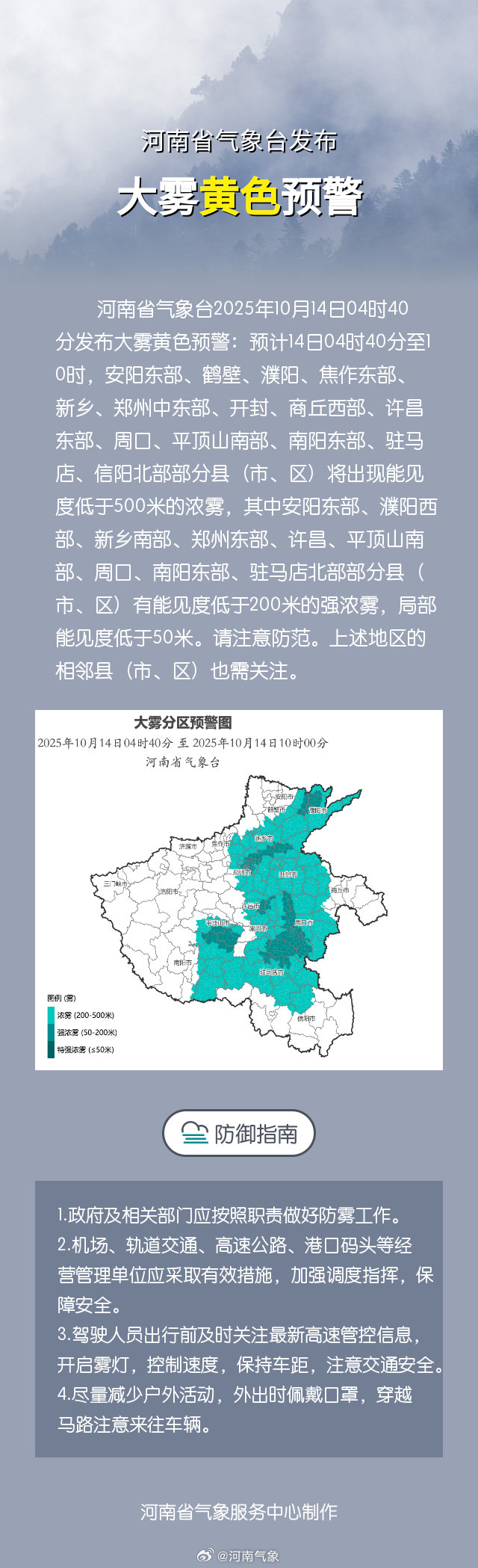 大象新闻记者10月14日从河南气象了解到,今天白天,三门峡、洛阳、南阳多云转阴天有小雨或零星小雨;其他县(市、区)晴天到多云。今天凌晨到上午,北中部、南部部分县(市、区)有雾。今天夜里到明天白天,全省阴天,大部有小雨或零星小雨,其中三门峡、洛阳西部、漯河、周口、商丘东部、驻马店、南阳、信阳北部部分县(市、区)有中雨。 全省偏东风2到3级。 最高气温:西部山区、东南部18到20℃;其他县(市、区)21到23℃。 最低气温:西部山区11到13℃;其他县(市、区)13到15℃。 河南省气象台2025年10月14日04时40分发布大雾黄色预警,截至早上6点40,河南 70个大雾等预警信号生效中,其中,杞县、卫辉市、西华县、上蔡县为大雾红色预警。