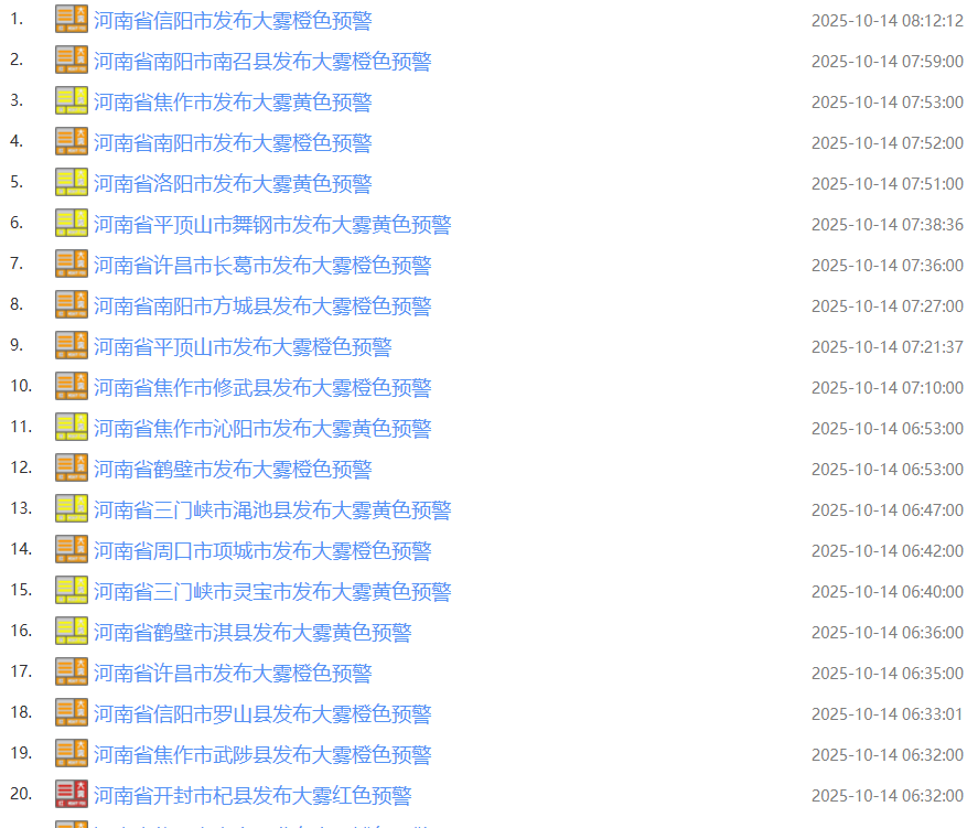 截至8:25,河南71条预警生效中,河南多地发布大雾预警信号。