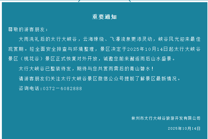 10月14日,记者从安阳林州市太行大峡谷旅游开发有限公司获悉,经全面安全排查与环境整理,太行大峡谷景区(桃花谷)景区于今日起正式恢复对外开放。