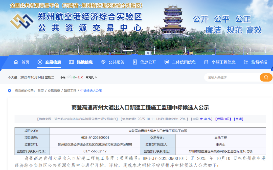 10月11日,郑州航空港经济综合实验区公共资源交易中心发布《商登高速青州大道出入口新建工程施工监理中标候选人公示》,就中标候选人进行公示。