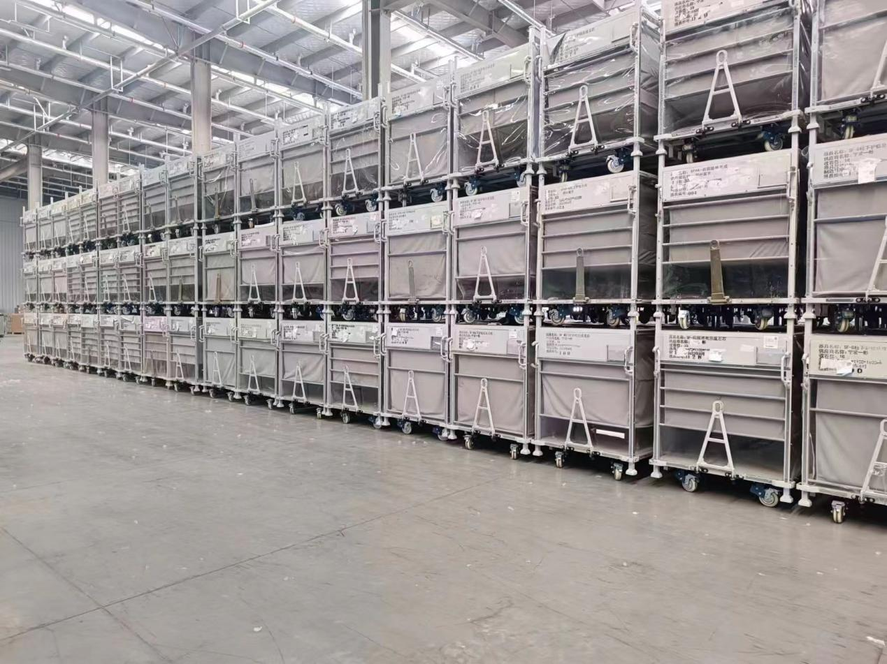 图:郑州国际陆港仓储区统一标准化周转箱提升货物转运效率