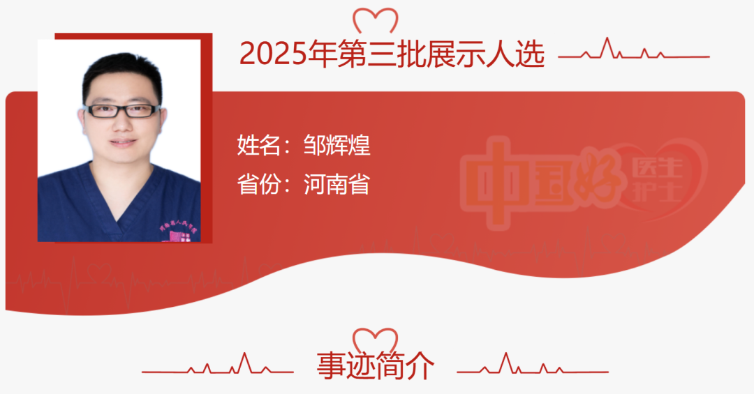 邹辉煌,男,1983年12月出生,中共党员,河南省人民医院重症医学科病区副主任护师、驻村第一书记。从重症病房到抗疫一线,从技术攻坚到乡村振兴,他冲锋在前,吃苦在先,用坚定的信念和无私的奉献,在平凡的岗位,努力践行着自己的责任与使命。2017年,获评国家卫生健康委优质护理服务表现突出个人;2020年,获评中共湖北省委、省政府“最美逆行者”;2021年,获中共河南省委组织部、河南省人社厅记功1次;2021年、2022年、2023年连续三年荣获河南省卫生健康委“优秀共产党员”荣誉。