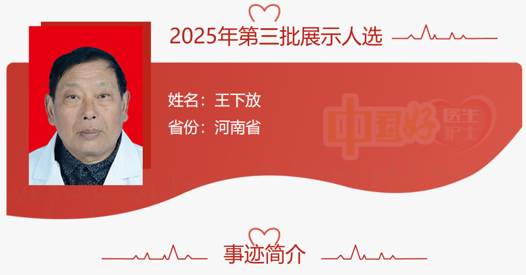 王下放,男,汉族,1959年7月生,焦作市博爱县寨豁乡田院村卫生室乡村医生。王下放是焦作市博爱县寨豁乡田院村卫生室乡村医生,46年间,他骑坏8辆摩托车,出诊7万人次,总里程超75万公里。寨豁乡95个自然村的每一条山路上,都刻着他的车辙印。多年来,王下放曾荣登“中国好人榜”、曾获河南省最美医务工作者等荣誉。
