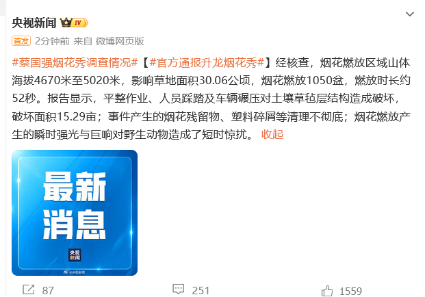据央视新闻消息,经核查,烟花燃放区域山体海拔4670米至5020米,影响草地面积30.06公顷,烟花燃放1050盆,燃放时长约52秒。报告显示,平整作业、人员踩踏及车辆碾压对土壤草毡层结构造成破坏,破坏面积15.29亩;事件产生的烟花残留物、塑料碎屑等清理不彻底;烟花燃放产生的瞬时强光与巨响对野生动物造成了短时惊扰。