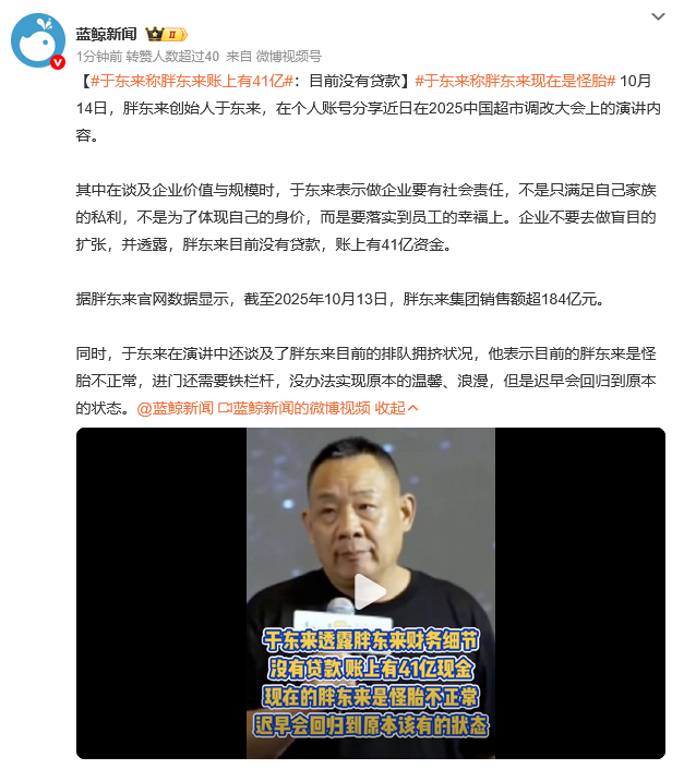 其中在谈及企业价值与规模时,于东来表示做企业要有社会责任,不是只满足自己家族的私利,不是为了体现自己的身价,而是要落实到员工的幸福上。企业不要去做盲目的扩张,并透露,胖东来目前没有贷款,账上有41亿资金。