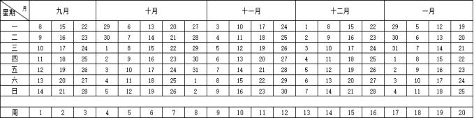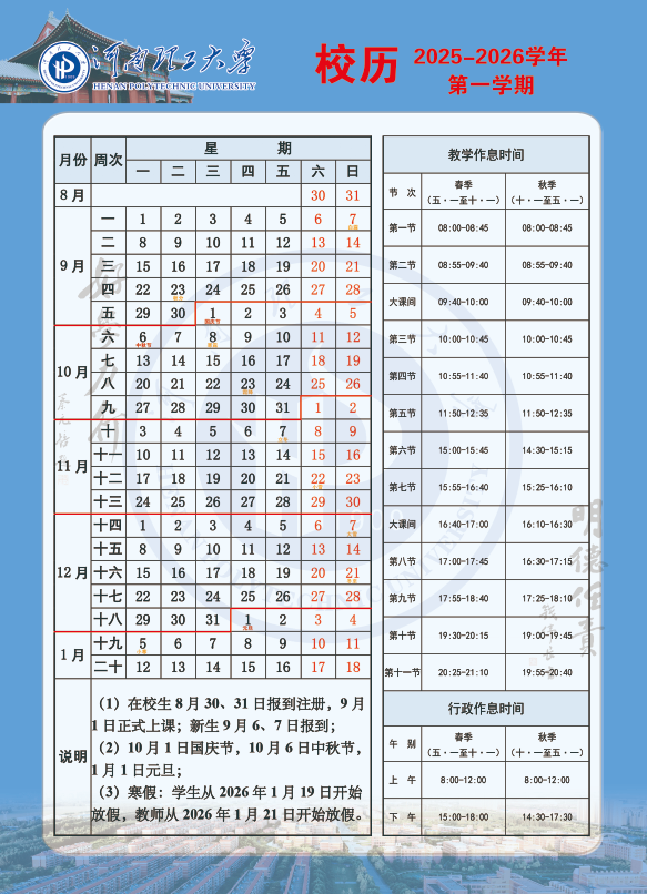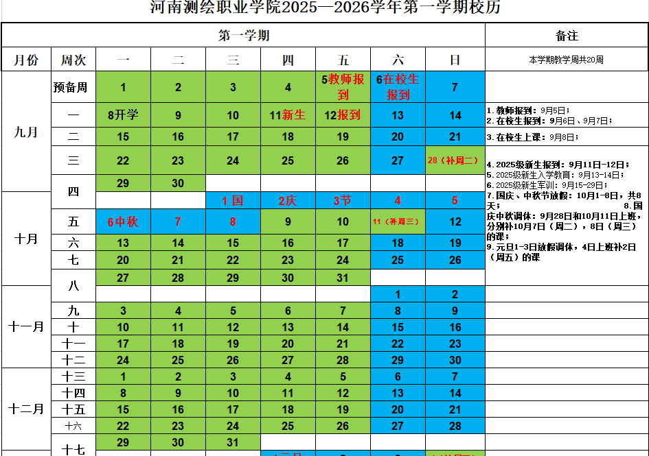 第一学期:2025年9月6日—2026年1月25日(20周)