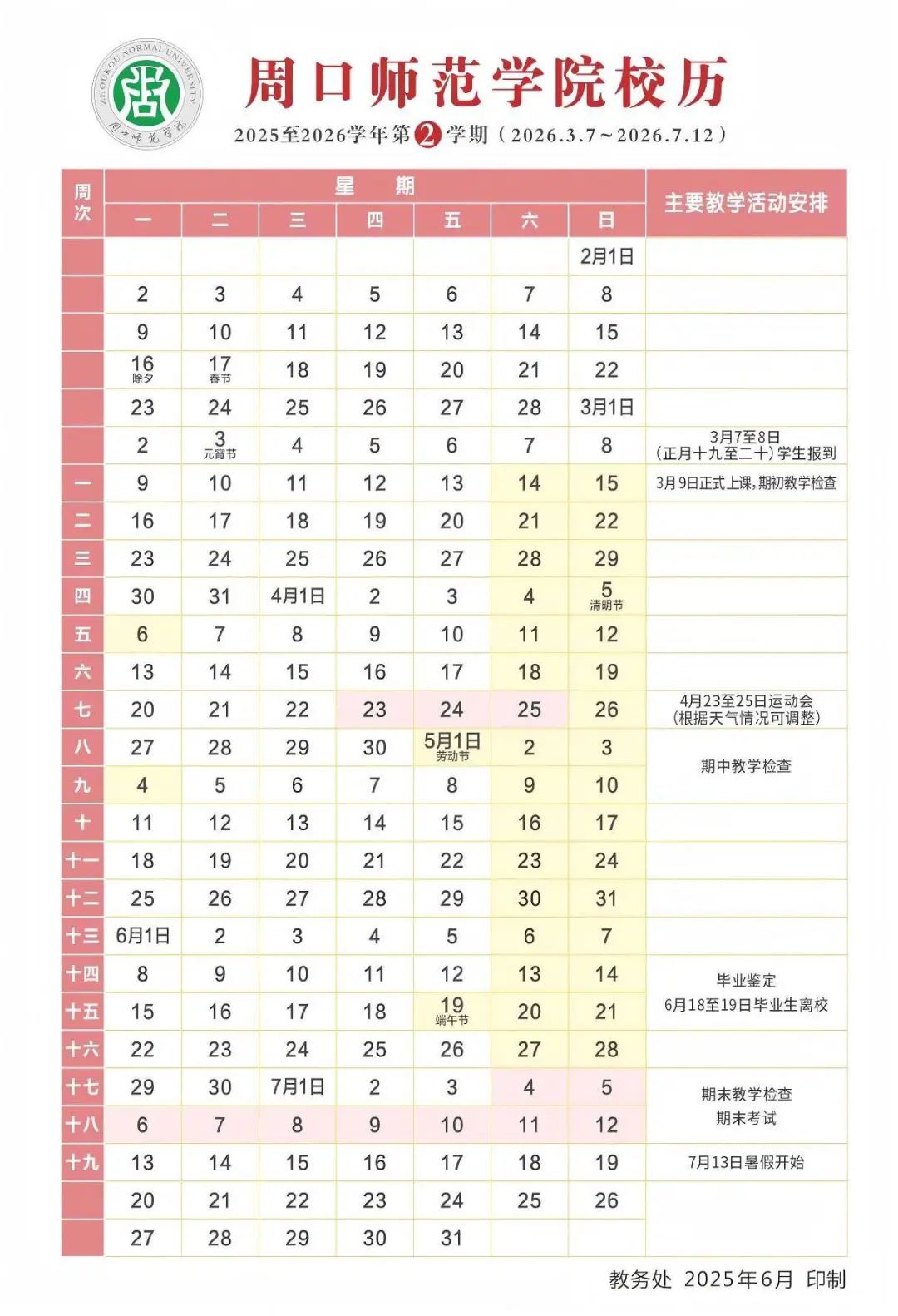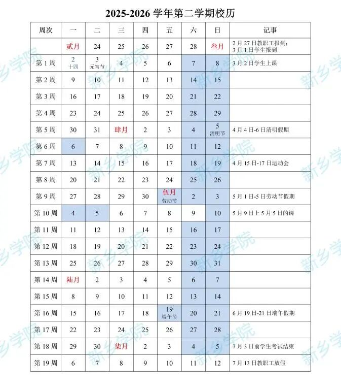 第二学期:2026年3月4日-2026年7月12日(19周)
