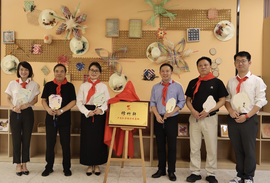 此次活动,又专门开设“修竹轩”少先队劳动实践基地,用于非遗等传统手工艺品的传承教育。在这里,与会嘉宾们现场体验了漆扇体验活动,在指尖操作中触摸非遗技艺的传承脉络。杭州市少工委副主任孙怡、上城区文广旅体局副局长陈仕清、上城区人社局副局长李丹、浙江师范大学兼职教授高琼以及笕文实验学校校长孙婕、副校长谢开源共同为“少先队劳动实践基地 “修竹轩”揭牌,标志着学校非遗教育有了更专业的平台。