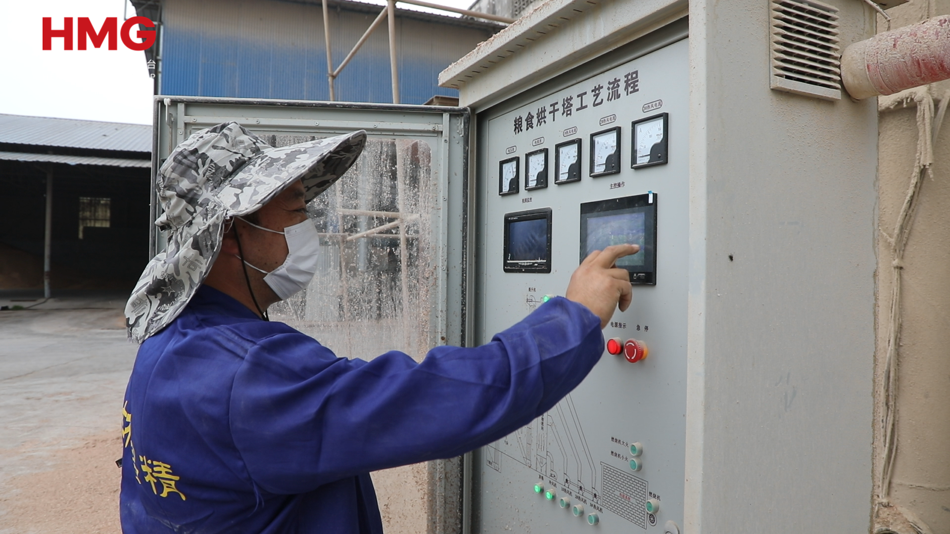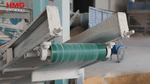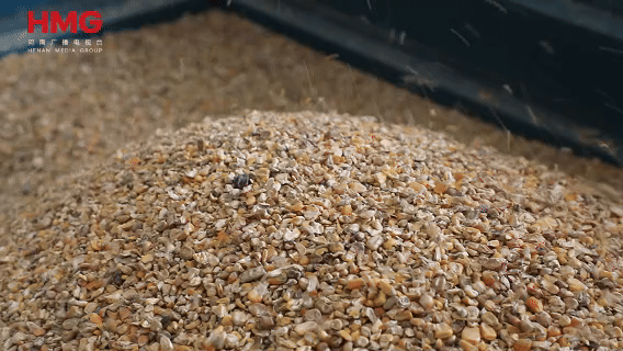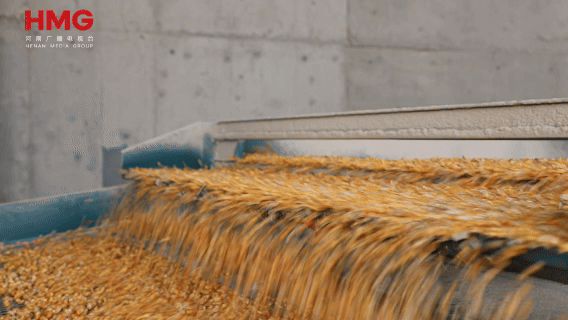 在烘干车间里,烘干设备正在高速运转,将烘干好的玉米传送出来,另一边的振动筛也配合到位,碎秸秆、小土块被快速分离出来,落到侧边的废料箱里。