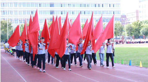 在挺拔的国旗方阵中,赤旗迎风展,少年步履昂,家国情怀与运动热忱在此刻交融。每一步都藏着对信仰的守望,蓝调节徽映着朝阳,数字“8”舞出跑道的昂扬,腾跃的学子,灵动的水波,体育动感与心理关怀在此刻绽放。