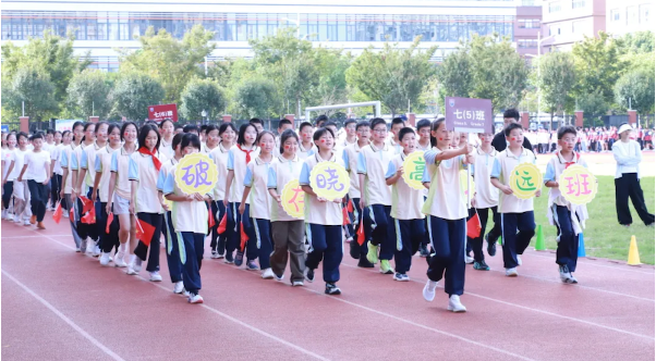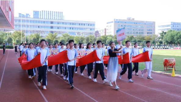 红旗方阵猎猎作响,九年级少年意气飞扬,花环缀满甜蜜期望,气球似火点燃赛场。
