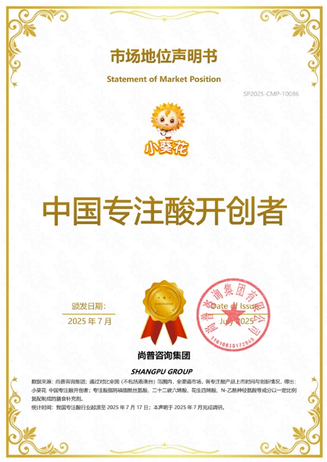 小葵花首次提出"专注酸"创新概念,并成功获得行业认定。该成分由磷脂酰丝氨酸(PS)、二十二碳六烯酸(DHA)、花生四烯酸(ARA)、N-乙酰神经氨酸(燕窝酸)等关键营养素按科学配比复配而成。研究表明,这一创新配方能够提升神经元传导效率,对注意力集中、记忆力提升及认知功能发展具有积极影响。