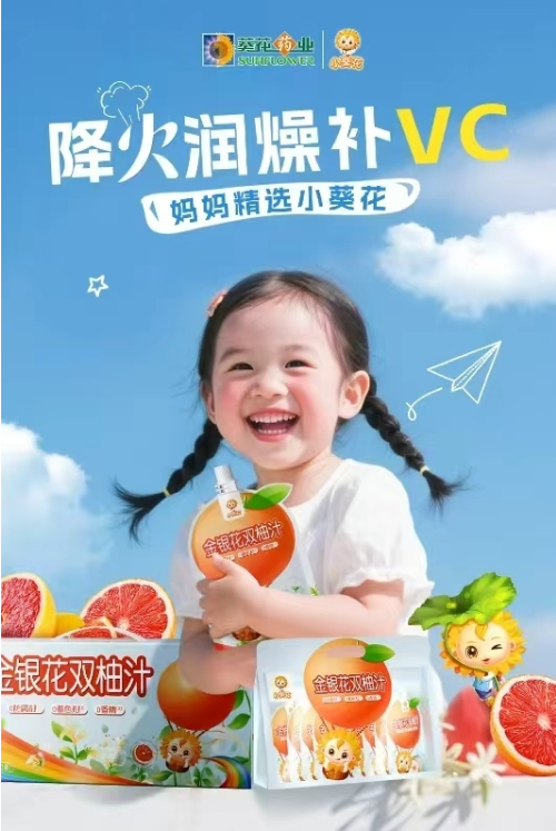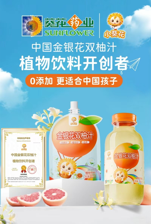 除了专注酸行业的创新性研发,小葵花依托20余年的儿童用药研发经验,对其产品“小葵花露”进行创新升级,推出2.0版本——金银花双柚汁。与市面上同类产品不同,该产品严格遵循国家植物饮料标准(GB/T 31326-2014)。以金银花、双柚等为核心成分的植物饮料,其中金银花含量位居配料表第二位,药食同源成分含量高,且呈现出清爽甘甜、柚香怡人的独特风味。