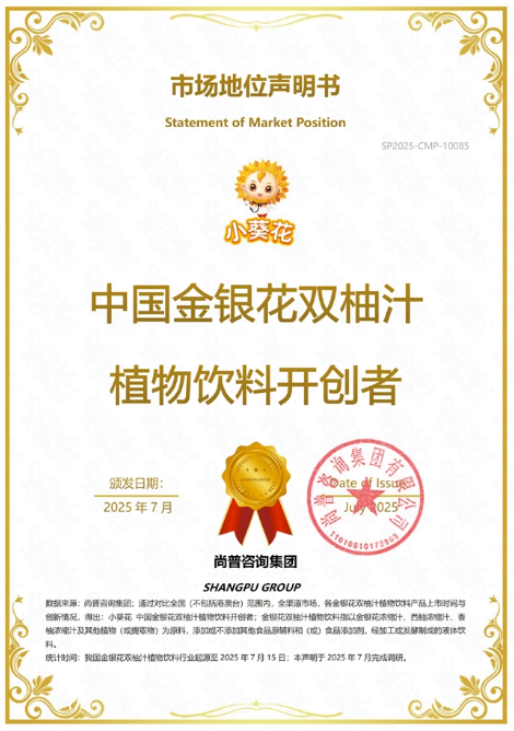 近日,葵花药业集团股份有限公司旗下品牌小葵花,获得尚普咨询集团有限公司(以下简称“尚普咨询集团”)颁发的“中国专注酸开创者”与“中国金银花双柚汁植物饮料开创者”市场地位声明书。该声明书由尚普咨询集团有限公司出具,数据基于尚普咨询集团对全国范围内,全渠道市场,各主要品牌经营情况及产品创新性情况调研分析及对比得出。