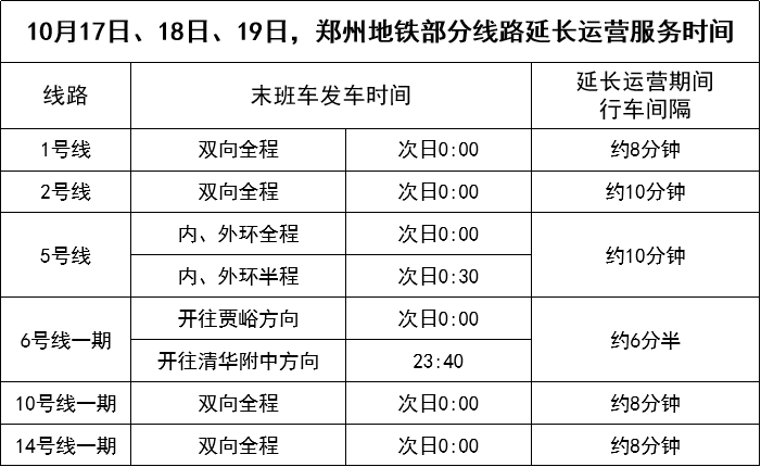郑州地铁结合活动客流特点,满足乘客出行需求,对线网运能进行优化配置,科学调整行车组织措施,10月17日、18日、19日线网部分线路延长运营服务时间,满足乘客出行需求。