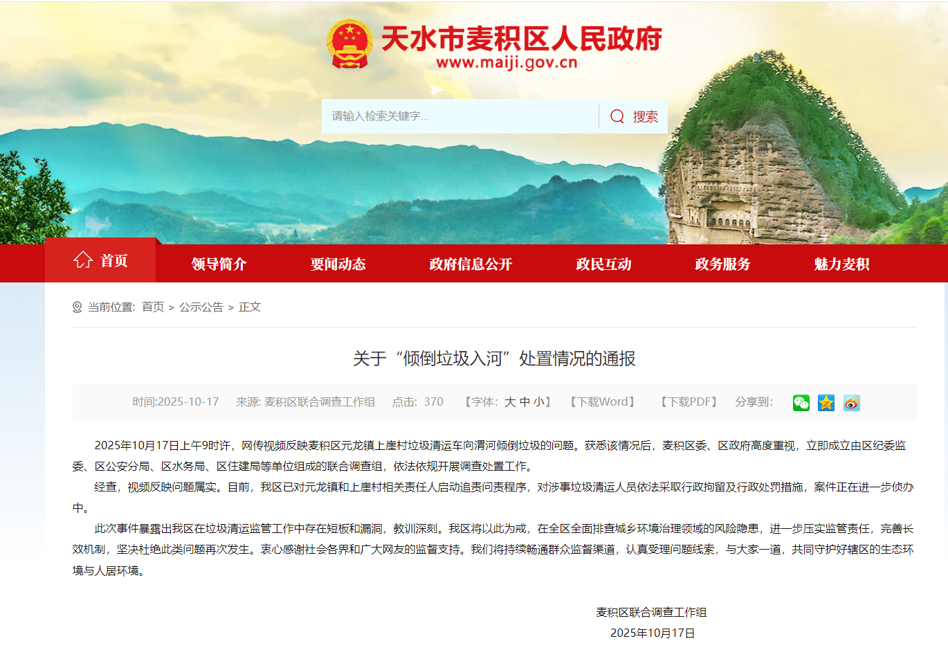 10月17日,大象新闻报道《甘肃一地垃圾转运车,被曝向渭河里倾倒垃圾》。麦积区联合调查工作组发布《关于“倾倒垃圾入河”处置情况的通报》,通报如下: