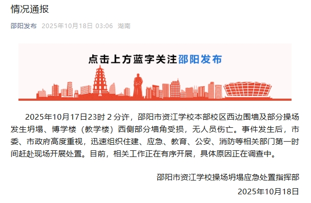 2025年10月17日23时2分许,邵阳市资江学校本部校区西边围墙及部分操场发生坍塌、博学楼(教学楼)西侧部分墙角受损,无人员伤亡。事件发生后,市委、市政府高度重视,迅速组织住建、应急、教育、公安、消防等相关部门第一时间赶赴现场开展处置。目前,相关工作正在有序开展,具体原因正在调查中。