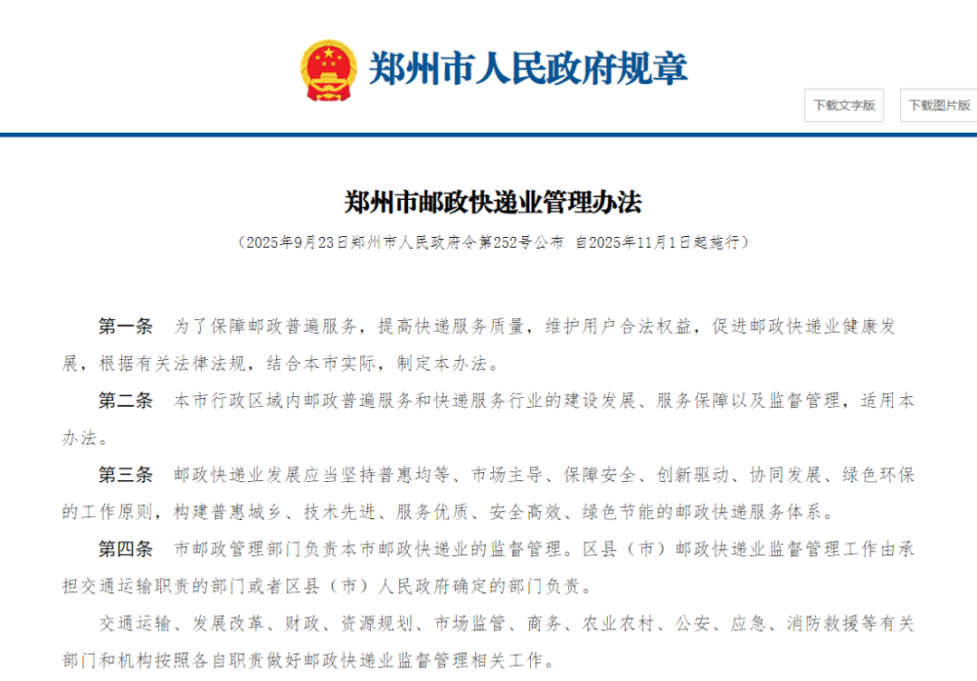 2025年9月23日郑州市人民政府令第252号公布,《郑州市邮政快递业管理办法》自2025年11月1日起施行!
