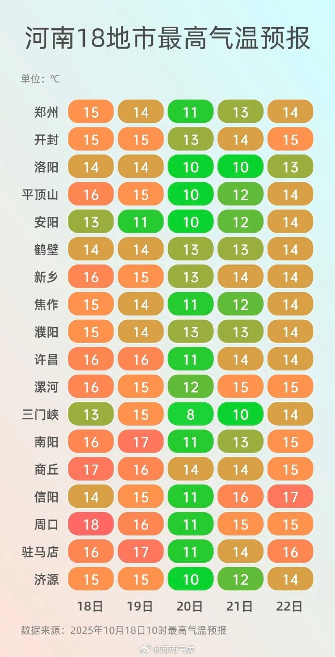 据河南气象消息,受冷空气持续影响,明天到20日,气温较前期下降8℃左右,20日全省大部最高气温仅有10℃出头,西部部分地区甚至不足10℃。最低气温将逐渐跌至谷底,仅有5-7℃,多地将迎今年下半年来最冷早晨。20日凌晨西部山区还将出现初霜冻。21日冷空气影响结束,但气温回升幅度不大,最高气温逐步升至14-18℃上下,最低气温更是回升乏力,预计未来五天多地仅有个位数。