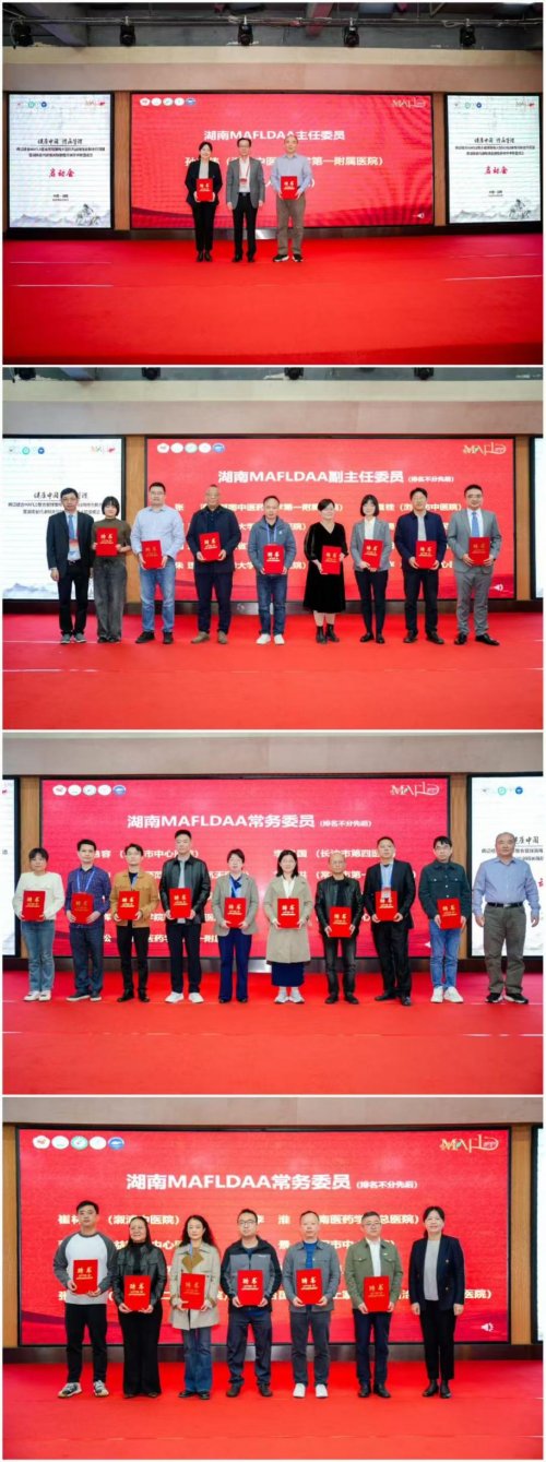 随后举行的聘任授牌仪式上,季光校长、陆伦根教授、谭琥书记、易刚强校长、周文君教授、孙克伟教授、张征教授、张涛教授等专家共同为湖南省MAFLD学术联盟新聘专家颁发聘书,并为科研工作站授牌。