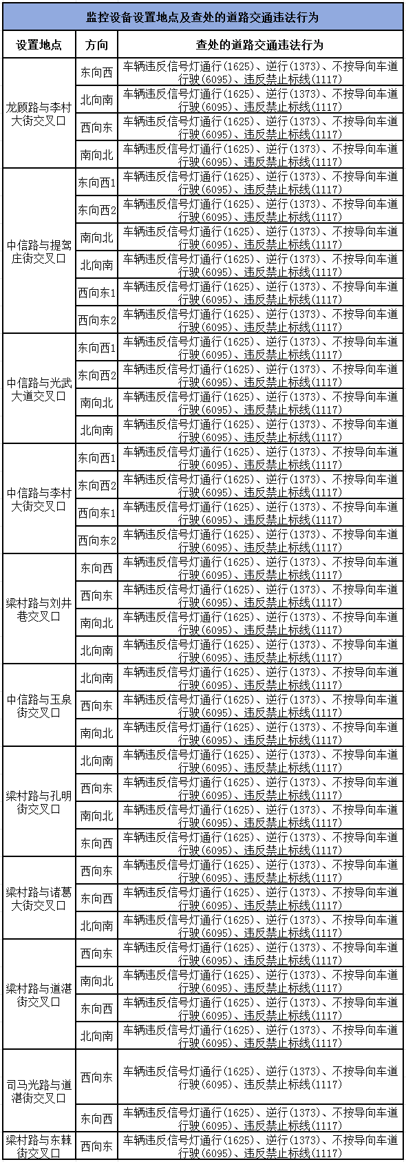 在伊滨区中信路、梁村路等道路,增设39套交通技术监控设备,用于查处车辆违反信号灯通行、不按导向车道行驶、违反禁止标线、逆行等交通违法行为,自2025年11月10日起开始启用。
