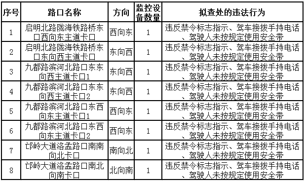 为加强道路交通安全管理,预防道路交通事故,洛阳市公安局交通管理支队在瀍河区增设8套交通技术监控设备,用于查处违反禁令标志、驾车接打电话、驾驶人未按规定使用安全带等交通违法行为,自2025年11月7日起开始启用。