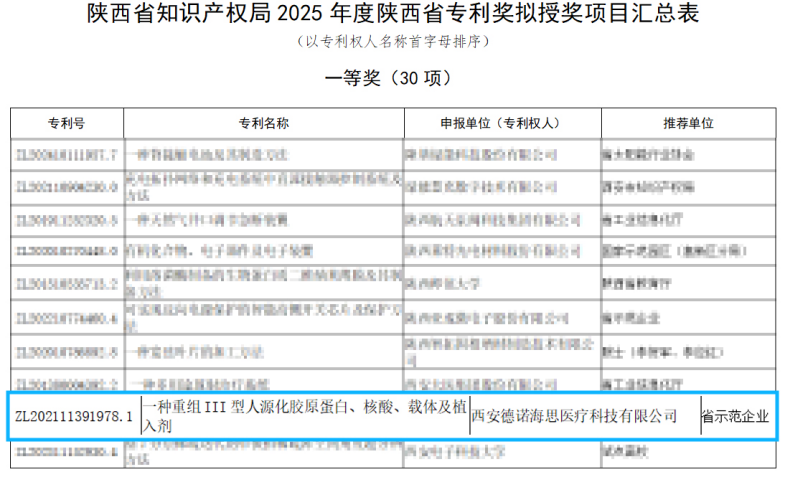 就在专精特新 “小巨人” 名单公示后不久,绽妍生物再传喜讯。陕西省知识产权局发布的2025年度陕西省专利奖拟授奖项目公示显示,绽妍生物研发中心德诺海思申报的《一种重组 III 型人源化胶原蛋白、核酸、载体及植入剂》(专利号 ZL202111391978.1)荣获一等奖。该奖项每三年评选一次,授奖数量严格控制,能在众多申报项目中脱颖而出,充分展现了绽妍在核心技术研发及知识产权转化方面的硬实力。