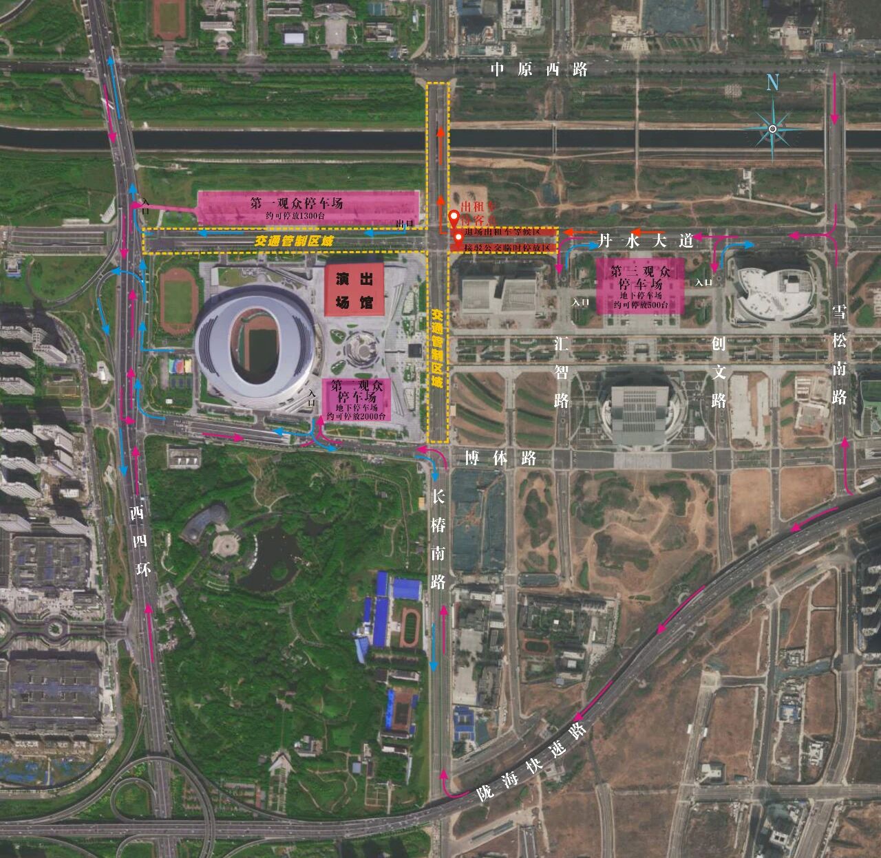 设在奥体中心北侧P2停车场。观众车辆经陇海西路地面层——西四环地面层——经西四环与丹水大道交叉口东北角停车场西入口驶入停车场(车辆进入停车场后,按照管理人员指挥进入指定位置停放);退场时,车辆出停车场东门——经丹水大道向西——西四环向北驶离活动现场。请扫描下方二维码导航前往停车场。该停车场饱和后,请根据交警及工作人员指挥或导航提示,前往其他停车场停放。